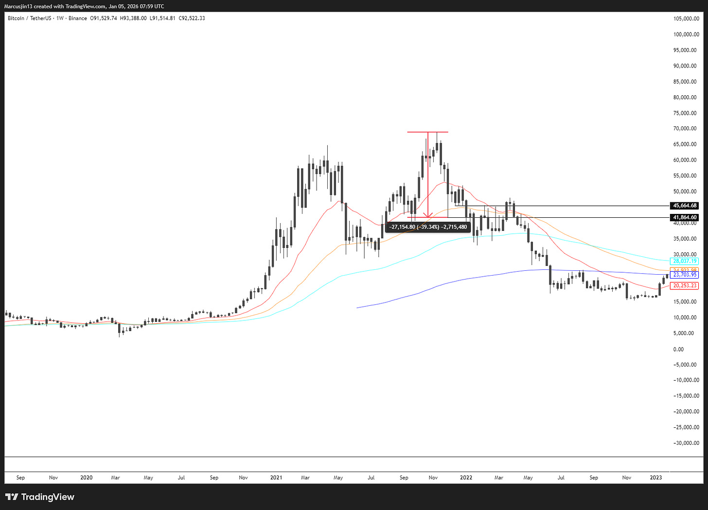 在 2021 年 11 月,BTC 正式進入熊市。當時的結構非常典型: